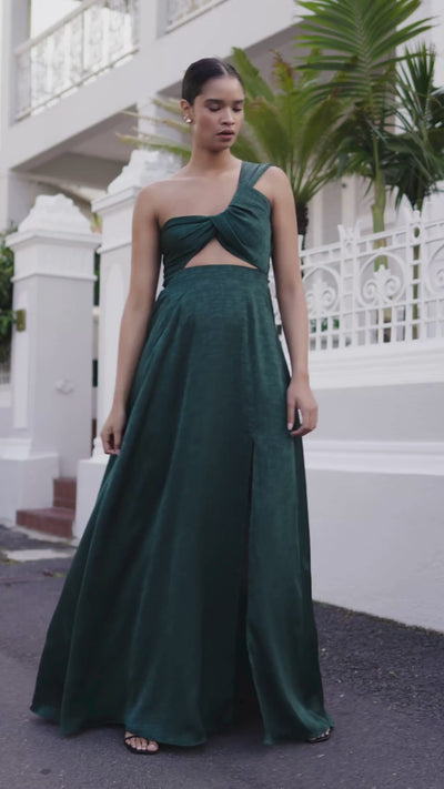 The Dalia maxi dress stands out with its one-shoulder design, keyhole cutout, and ruched elastic detail for a flexible fit. A tie-back closure adds adjustability, while a bold front slit completes the look.