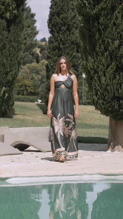 The Dalia Maxi Dress stands out with its one-shoulder design, keyhole cutout, and ruched elastic detail for a flexible fit. A tie-back closure adds adjustability, while a bold front slit completes the look.