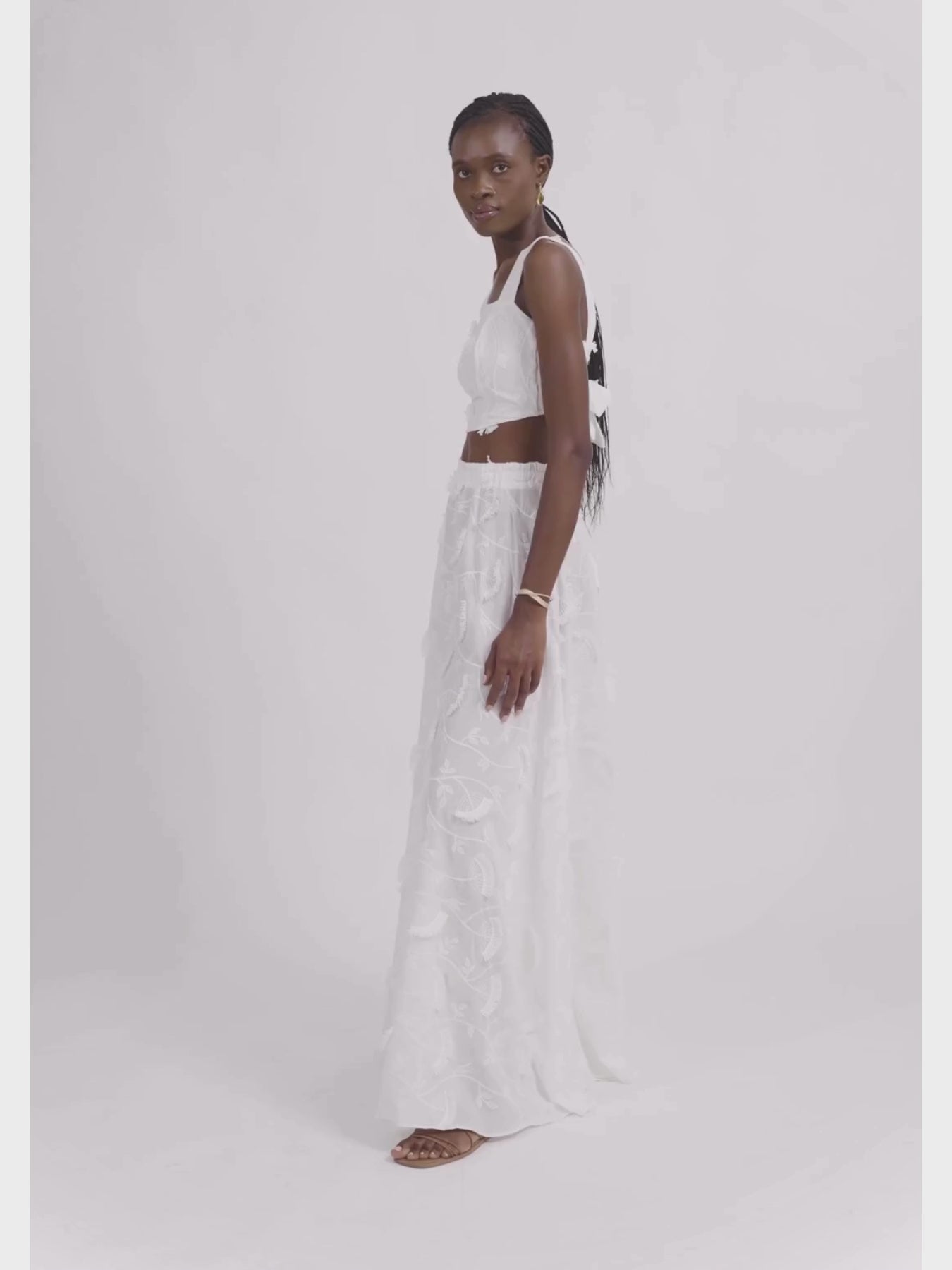This sleeveless crop top features a clean square neckline and an adjustable fit with back straps for added versatility. Intricate embroidery adds a touch of elegance, making it the perfect piece for any occasion.