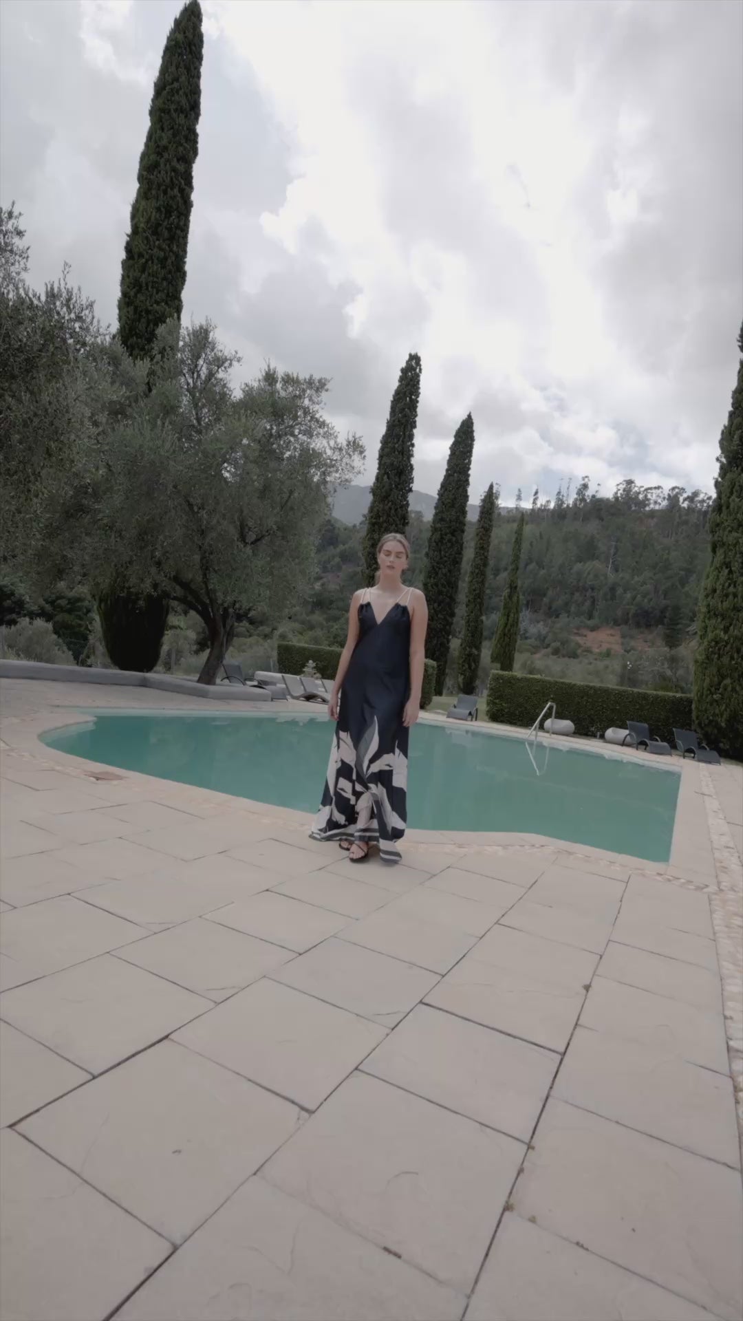 This effortlessly elegant maxi dress features delicate rope straps that extend to the back, tying into a subtle bow for an adjustable fit. The flowing A-line silhouette and deep V-neckline at the front add a touch of allure.