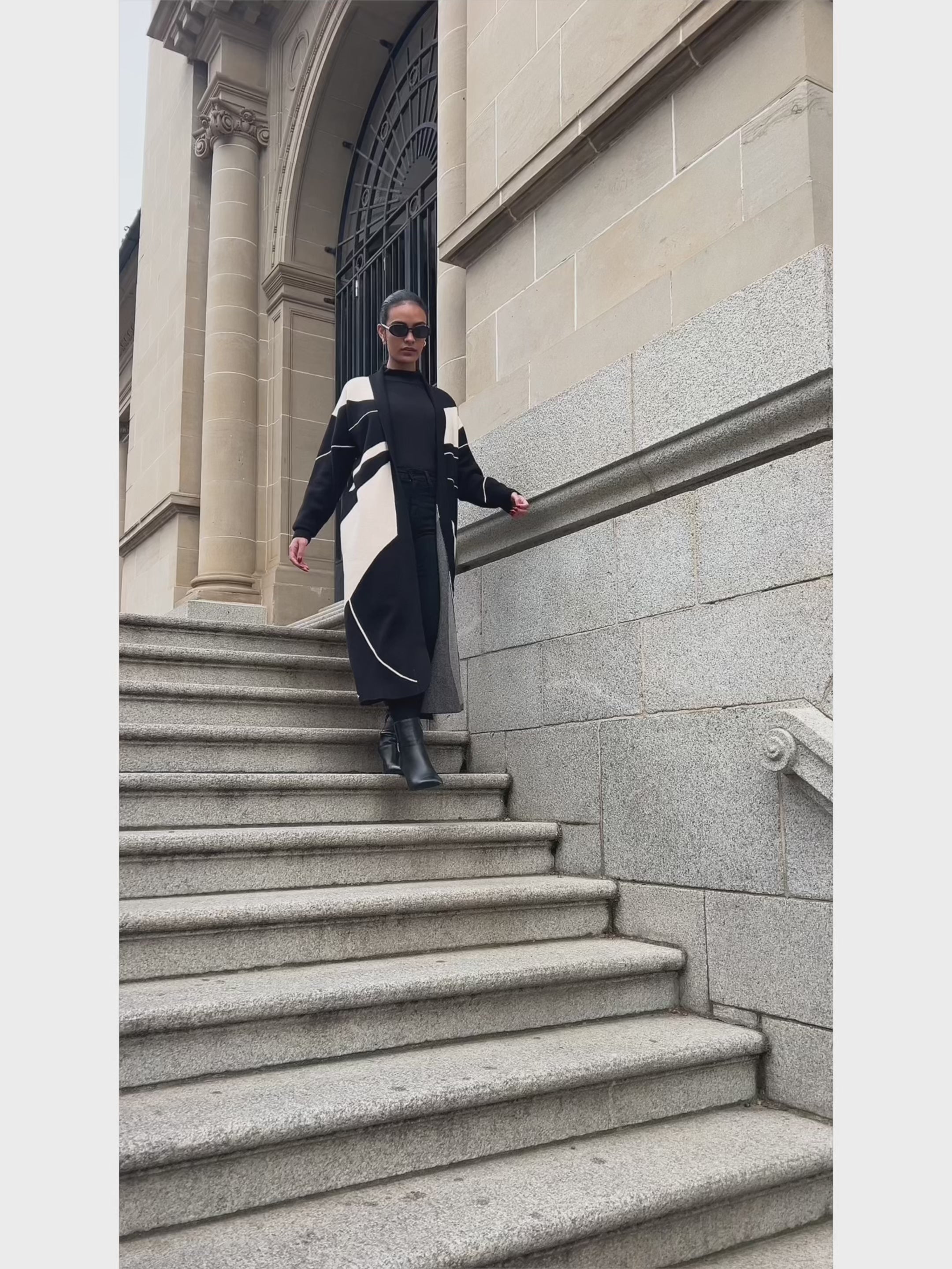 Featuring a striking abstract pattern, the Liya Long Cardigan can be worn open for a relaxed look or cinched at the waist with a detachable belt for a more defined silhouette. This is a versatile addition to your wardrobe perfect for any time of day.