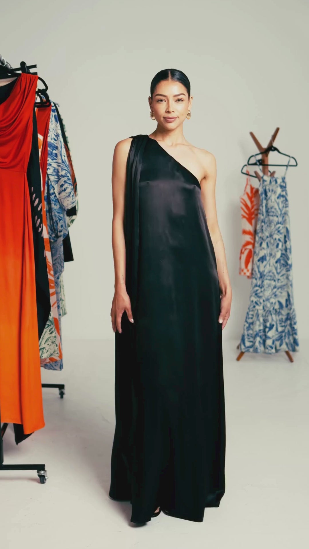 The Raya Dress is a striking one-shoulder maxi with a flowing silhouette. Featuring a side zipper and long shoulder ties, it can be worn cascading for dramatic movement or styled into a bow for a polished finish.