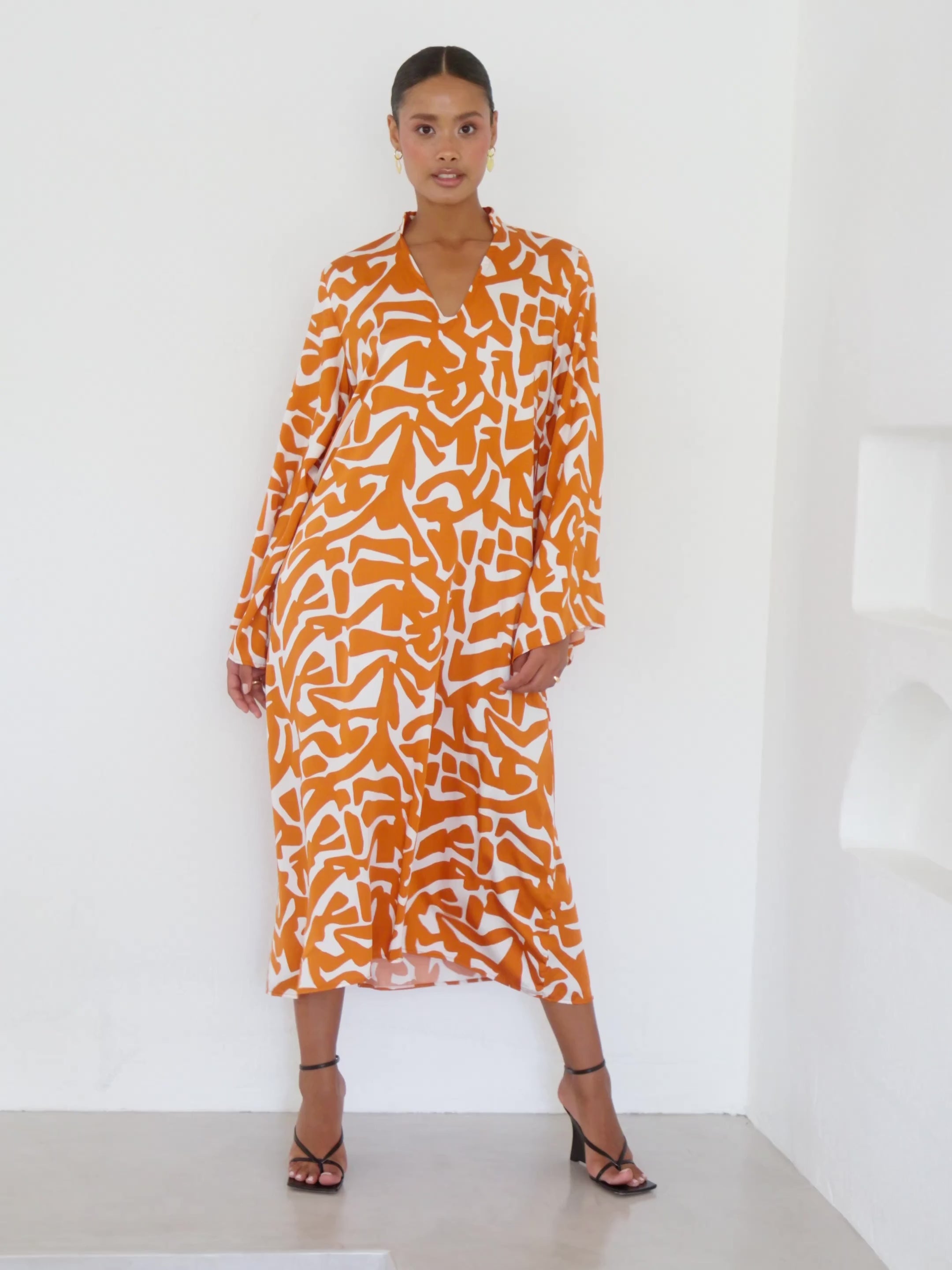 Introducing our Rama Dress in Tali Orange, a chic addition to your resort wardrobe. Crafted from 100% printed lyocell satin, this calf-length caftan features bell sleeves and a v-shaped collarless neckline, with a vibrant orange graphic print, offering effortless style and comfort for your daytime adventures.