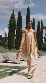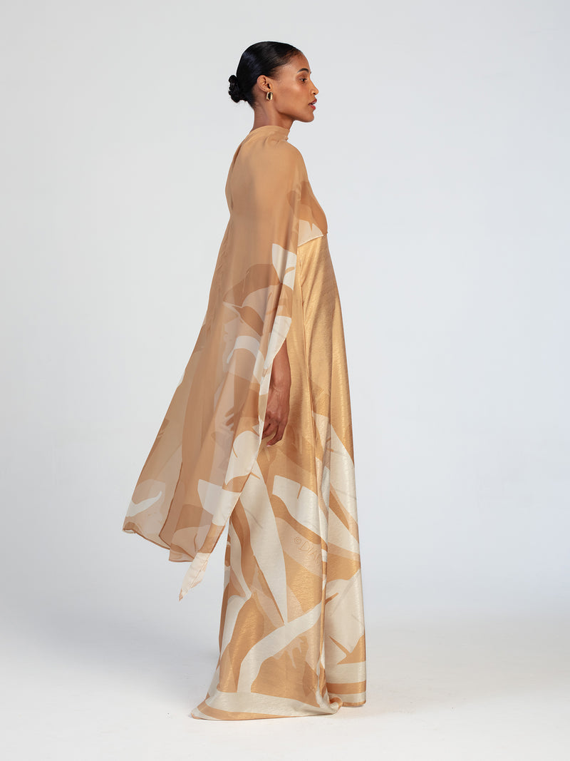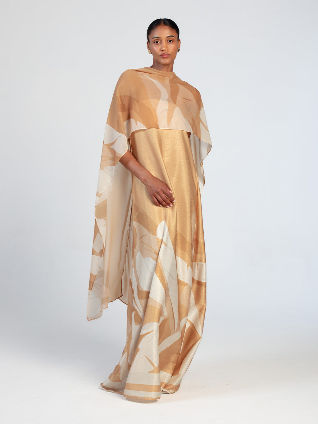 This strapless tube dress is paired with a lightweight chiffon cover-up that effortlessly transforms into a cape or draped wrap. Crafted from airy, flowy fabric, it’s a versatile piece designed to make a statement and elevate any occasion with effortless elegance.