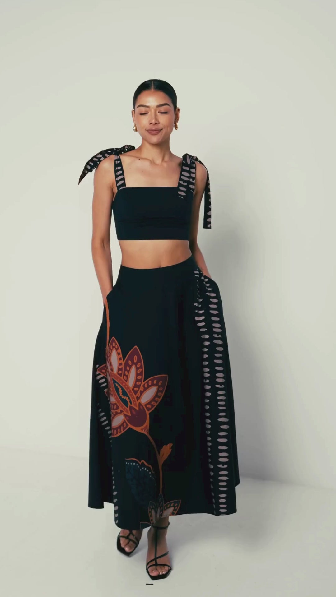 A square-neck crop top with adjustable tie straps that can be styled into bows for a playful finish. Designed with a fitted silhouette, back zipper, and elastic for comfort, it pairs effortlessly with high-waisted skirts or relaxed trousers.